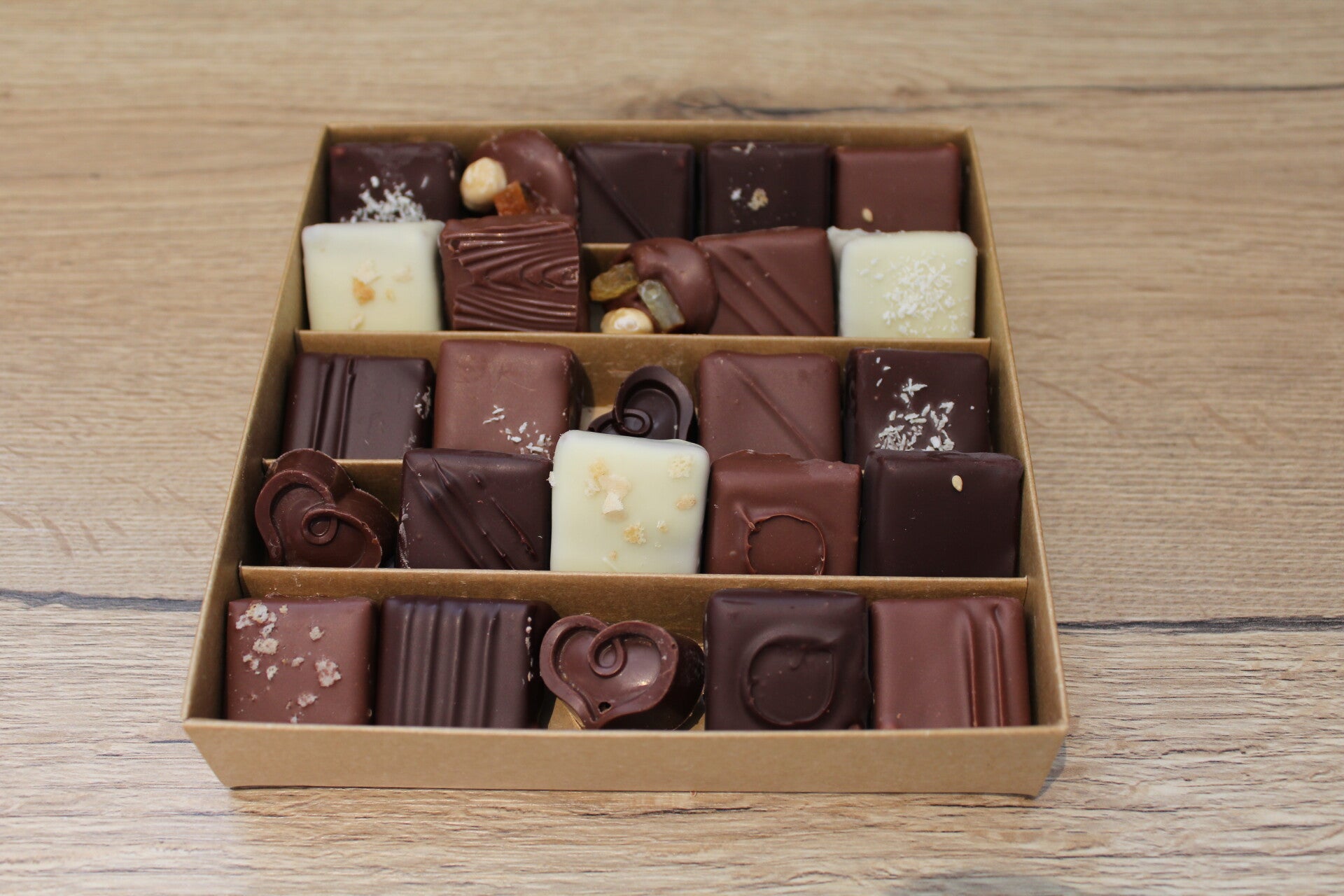 Assortiment de praliné, mendiant, interieur caramel et framboise. Assortiment de trois chocolats (noir, lait et blanc).